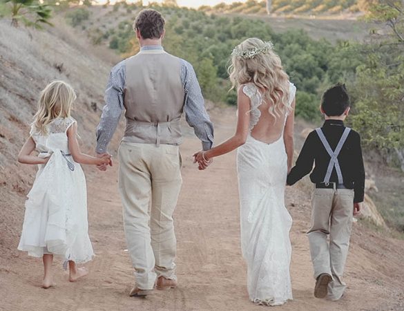 Baby got back! Seriously, this shabby chic bride's wedding dress is a show stopper. This adorable family is celebrating the blending...